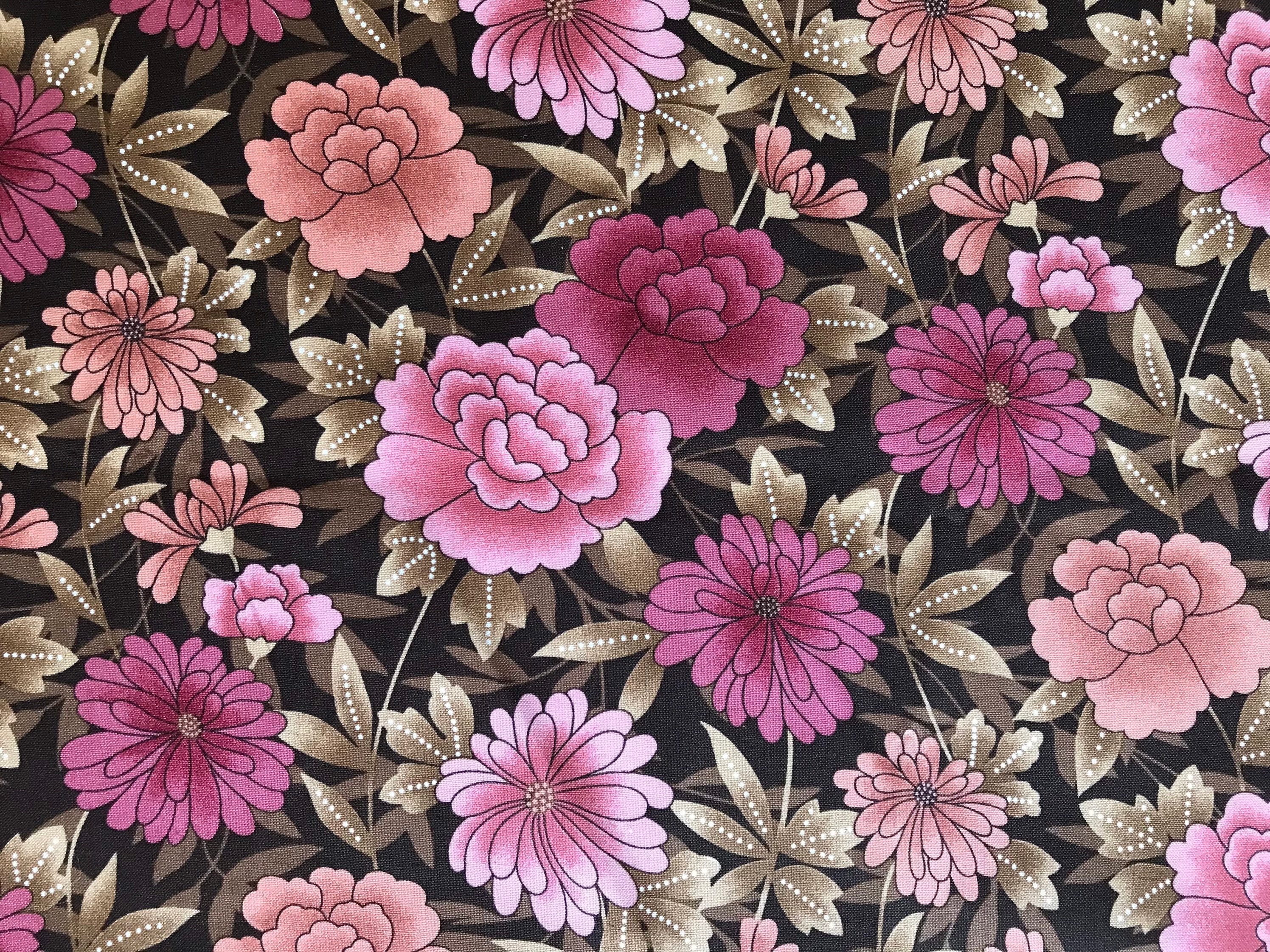 Large Floral Print Fabric Pink Flowers On A Brown Base Etsy Ireland